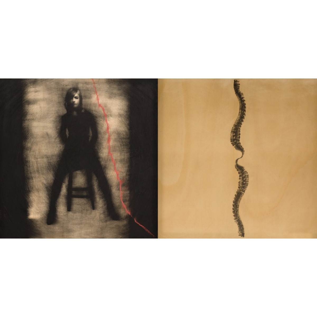 Omar Galliani's work, titled "Se non apri gli occhi" (If You Don't Open Your Eyes), is a diptych that addresses themes of perception, the body, and interiority. The left panel features a seated female figure on a stool, enveloped in the deep chiaroscuro created with graphite, typical of Galliani's sfumato technique. The body is vertically bisected by a vibrant red line that, like a scar or a wound, introduces the chromatic element of passion and the sacred, slicing through the dominant black.