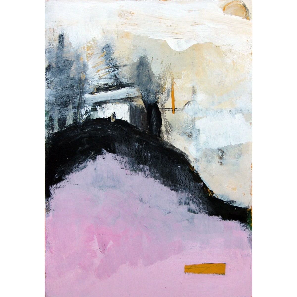 A powerful vertical composition created with mixed media, where the landscape transforms into pure chromatic emotion. A vast pink area in the foreground is dominated by a dark, textured hill, behind which faint urban profiles and tree-like shapes emerge, dissolving into a thick, light-filled white sky.