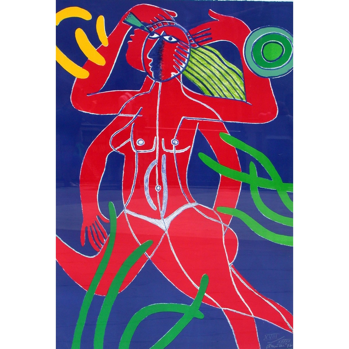 This screenprint, dated 1992, is the work of Guillaume Corneille, co-founder of the CoBrA group. The artist explores the female figure with a bold graphic language, utilizing sharp lines and flat areas of colour. The subject is dominated by bright red against a blue background, with accents of yellow and acid green emphasizing its dynamism. The piece is a vibrant example of his later style, characterized by figurative themes and intense chromatic expression.