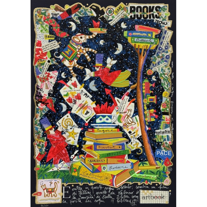 This polymateric screen print is an explosion of nocturnal fantasy, featuring a dark blue, glittered background that evokes a starry sky. The composition is dominated by an unstable tower of coloured books, resting on the ground and serving as the base for the dreamlike scene. Among the volumes, names of illustrious authors like Calvino, Borges, and Rodari are visible, highlighting the power of literature as a source of dreams. The artist seals the work with a poetic reference to the dream and Fellini's cinema.
