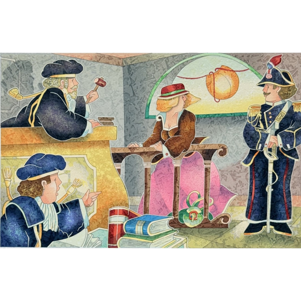 The scene is in a courtroom in an indoor setting. Figures in period costume, surround a female figure at the center. The artist's characteristic hot air balloon appears in the background, along with books and mysterious symbols, adding a touch of theatricality and allegory to the formal encounter.