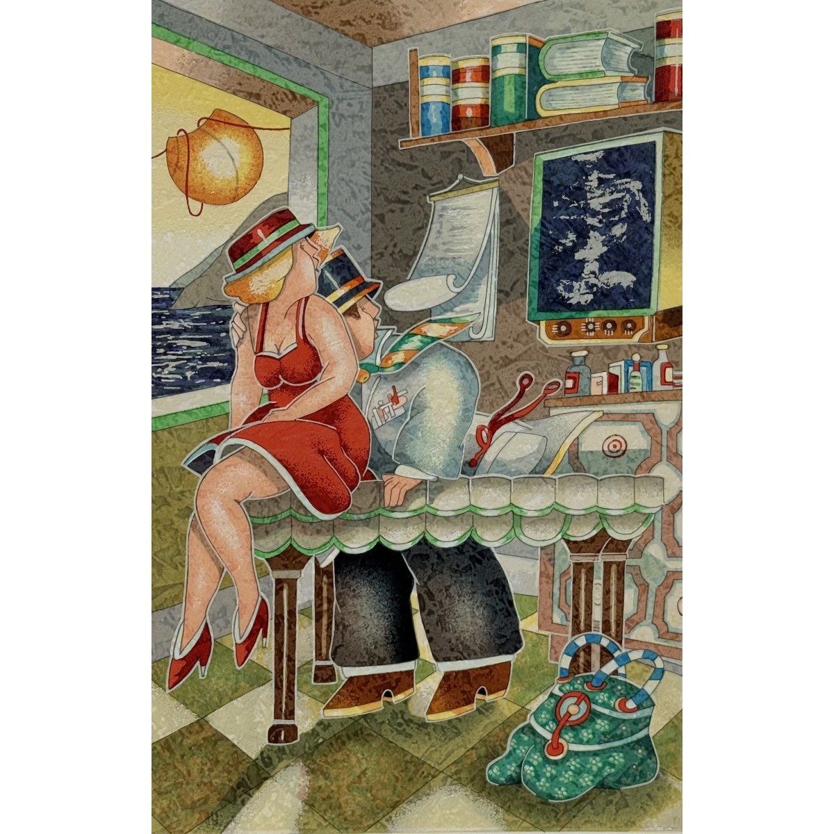 The serigraph represent an intimate encounter in a study. A woman in a red dress and a man are seated or lying on a richly decorated table, surrounded by instruments and notes. The characteristic hot air balloon is visible outside the window overlooking the sea, lending an atmosphere of dreamlike seduction to the scene.