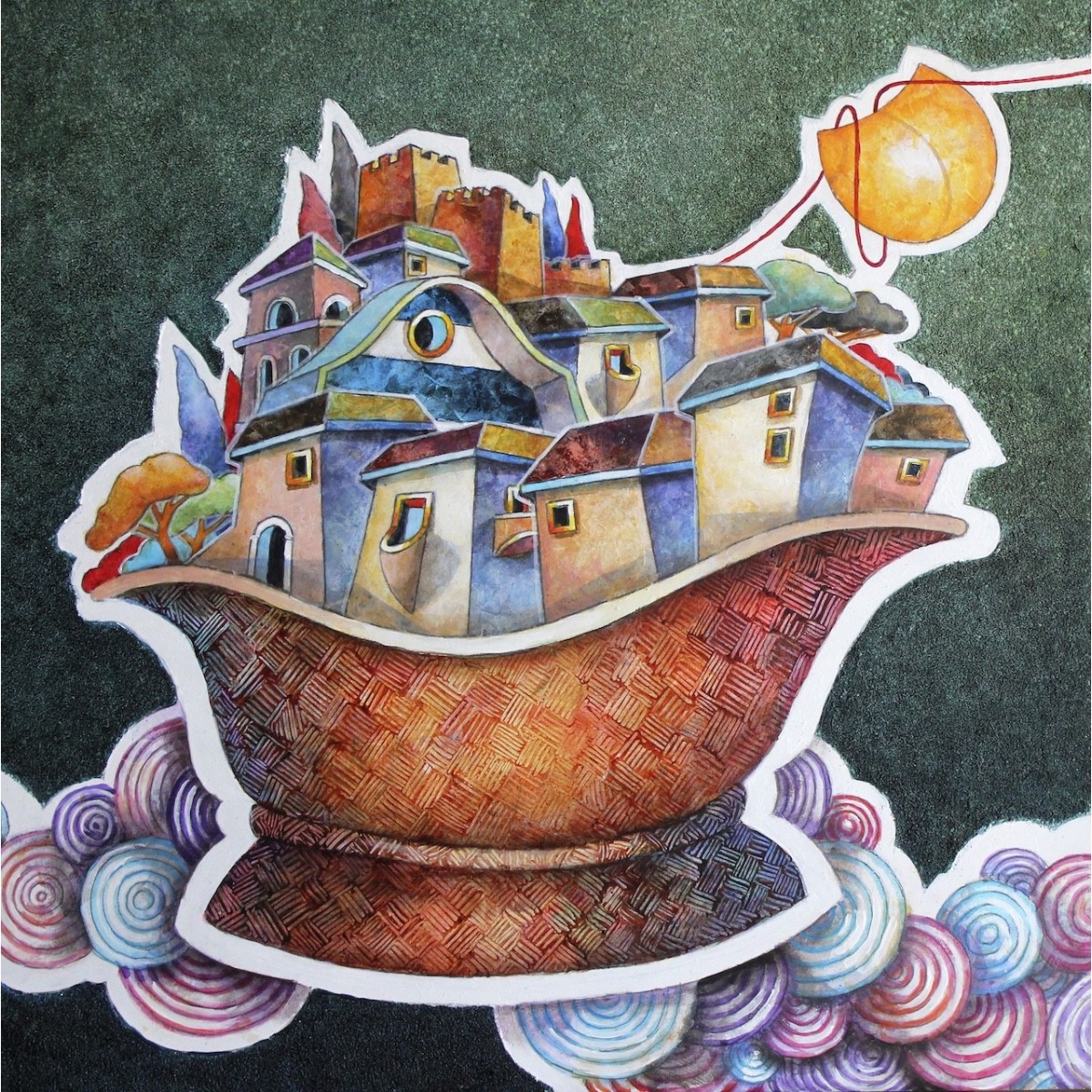 This painting by Francesco Nesi, titled “Volo” (Flight), presents a fantastical urban landscape—a kind of suspended village—that magically floats within a woven hat. The artist, using a vibrant palette and playful strokes, constructs an image that defies gravity and logic, transporting the viewer into a dreamlike world. The colorful houses and pointed roofs, though recognizable, come alive with a life of their own, almost like creatures inhabiting a cozy nest.