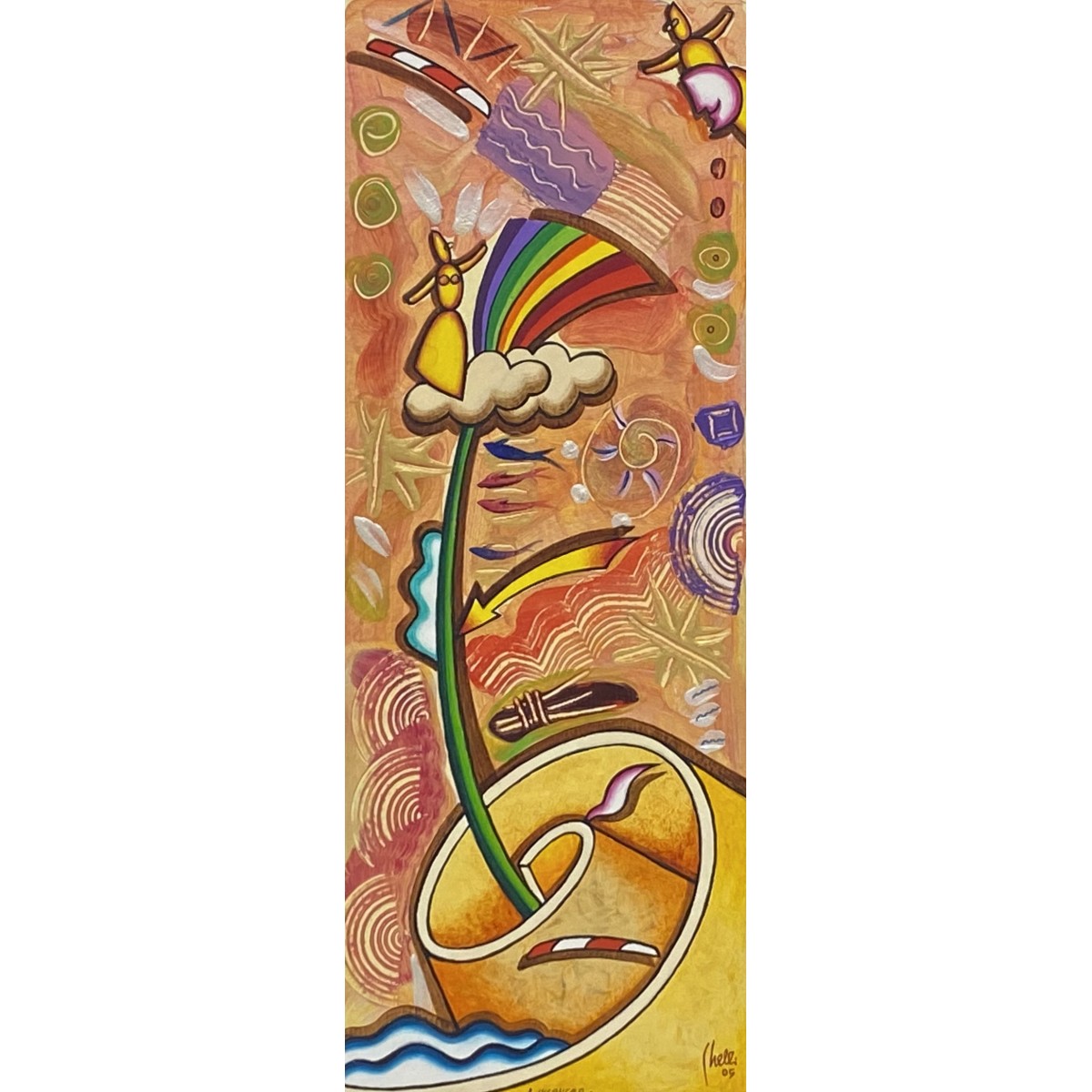 Giuliano Ghelli develops a vertical composition where a long green stem rises towards an explosion of joyful symbols, such as a rainbow and an anthropomorphic figure appearing to dance on clouds. The background, played in warm ochre and orange tones, is dotted with spiral shapes and stylized fish swimming through the ether, creating a sense of cosmic harmony and perpetual motion. The work perfectly embodies the artist's "Neopop" style, transforming elements of memory and nature into a fantastic alphabet with sharp outlines and a vibrant narrative rhythm.