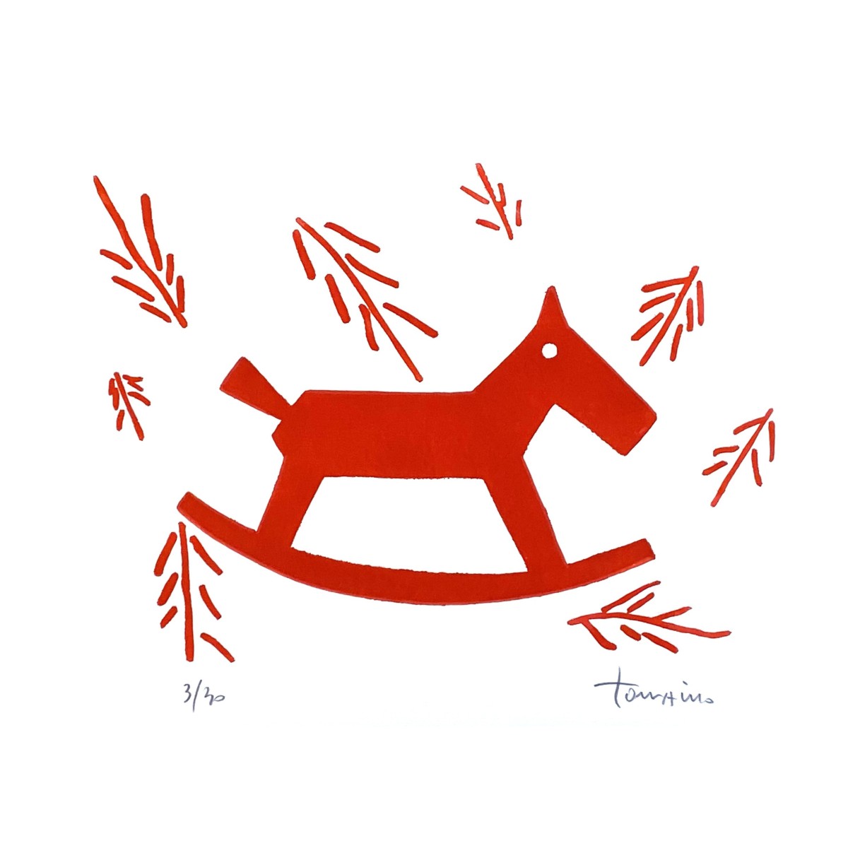 Italo by Giuliano Tomaino, created using red-toned etching and drypoint, features a sharp and essential graphic line. The image, often associated with the symbolic motif of a rocking horse, evokes memory, childhood, and play with strong visual impact. The use of red enhances the emotional tone, giving the artwork a character that is both minimal and evocative.