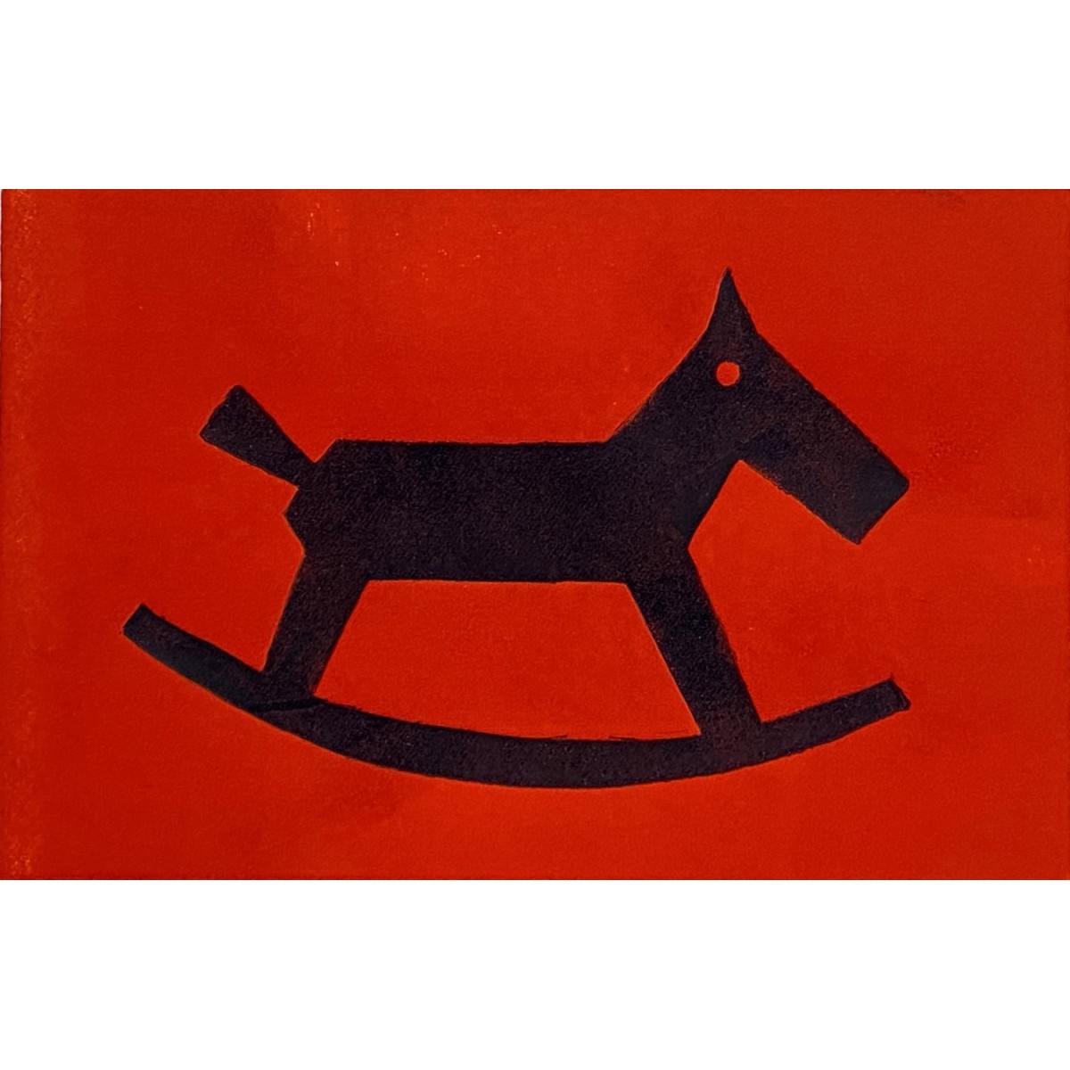 L'incisione presenta un'immagine audace e sintetica del cavallo a dondolo, un soggetto ricorrente per Tomaino. Il soggetto è reso come una silhouette nera geometrica posta in forte contrasto con un campo rettangolare di rosso intenso e piatto. La composizione sfrutta il contrasto cromatico netto per conferire all'opera un'energia visiva immediata.