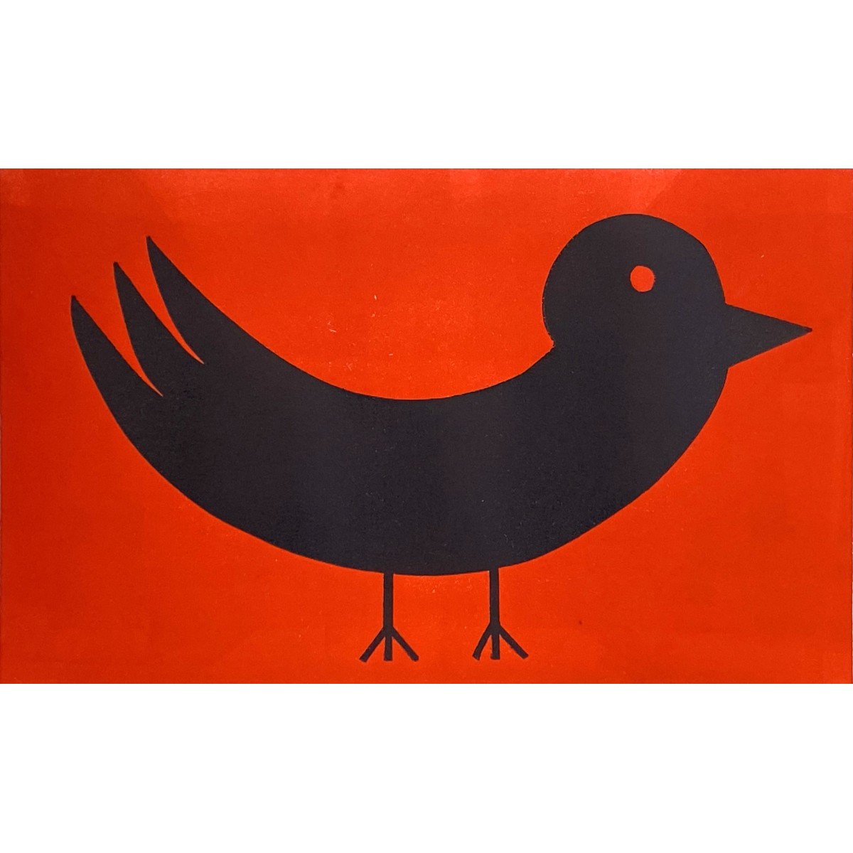 The last image by Giuliano Tomaino is a calcography featuring a stylized bird in an intense black color on a red background. The form is extremely simplified, almost a pictogram, composed of essential curves for the body and head, with three fan-shaped feathers and two thin legs. The minimalist style and flat color create an iconic and immediately recognizable image, typical of the artist.