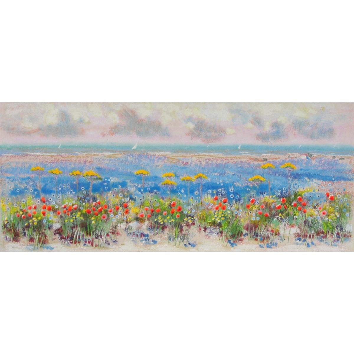 This silkscreen print, titled "Festa di primavera" (Spring Celebration) is a horizontal landscape characterized by a vibrant floral composition. In the foreground, a riot of red, yellow, and blue flowers spreads across a meadow that slopes down towards a calm sea. The horizon line is high, leaving space for a faint, cloudy sky, with small white sails dotting the water in the background, evoking a serene and dreamlike atmosphere.