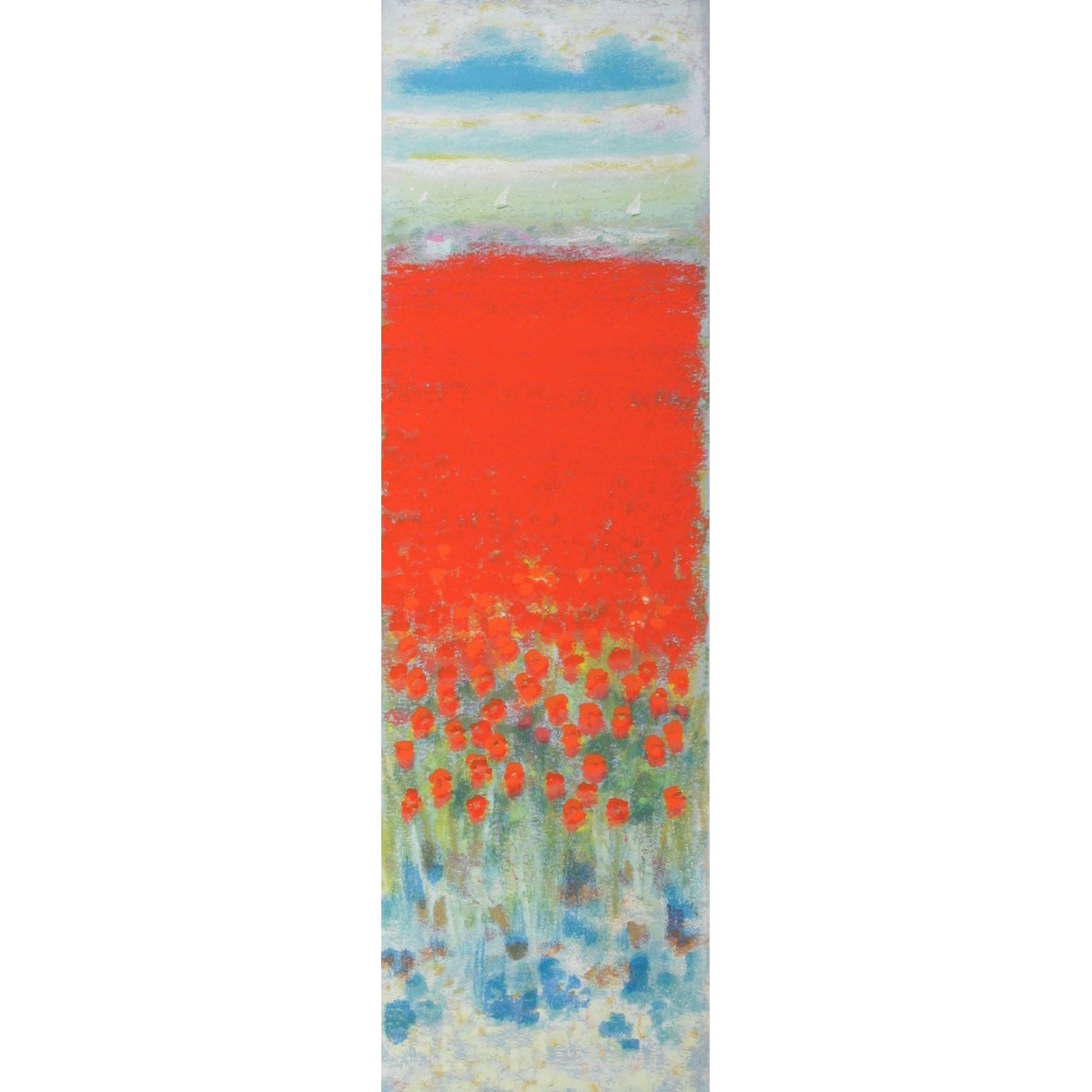This vertical silkscreen print by Natale Addamiano, titled "Papaveri" (Poppies) (2004), is dominated by an intensely red-orange field, symbolizing poppies in full bloom. The composition is divided into three horizontal bands: at the bottom, more defined flowers are visible on a green and blue meadow; in the center, a vast field of vibrant red with a gestural texture; and at the top, a soft horizon and a light blue sky with white clouds. The silkscreen print captures a scene rich in light and color.