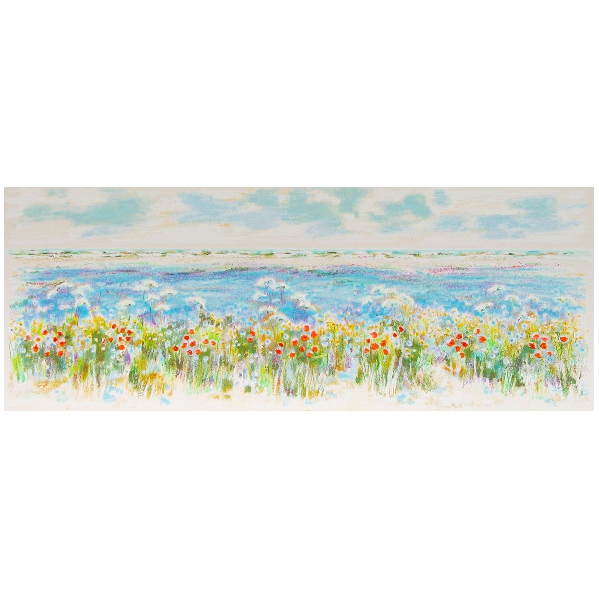 A panoramic view dominated by pastel tones, where an expanse of wildflowers and red poppies in the foreground gives way to the delicate blue of flax fields, beneath a bright sky streaked with light clouds.