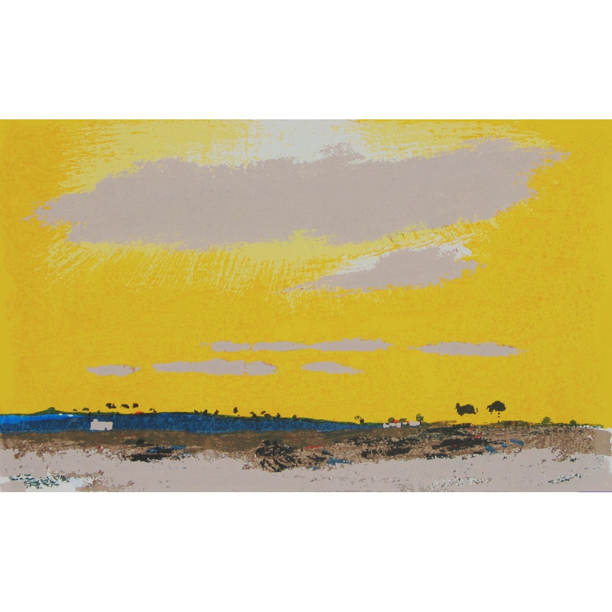 A vibrant and luminous lemon-yellow sky dominates the scene, overlooking an essential rural landscape. A large, frayed gray cloud crosses the upper part, while on the horizon, the dark earth is dotted with small silhouettes of trees and houses, rendered with concise and bold strokes.