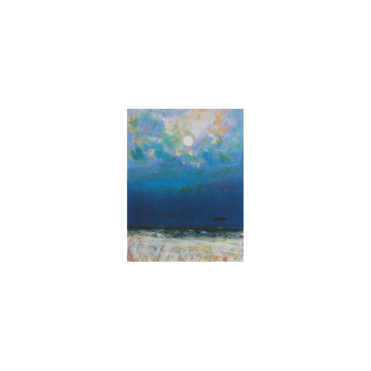 A lyrical and soft vision where a white moon shines through azure and cerulean clouds. The landscape below is faintly sketched, immersed in the darkness of the night, evoking a deep sense of stillness.
