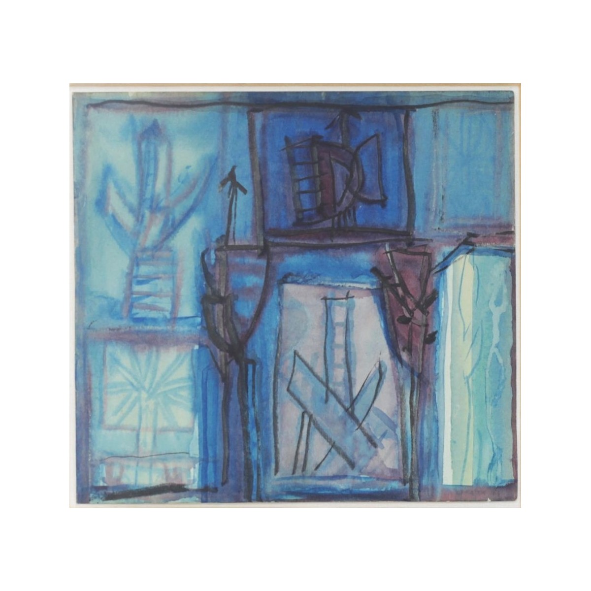 In this "Untitled" (1961) work, Riccardo Licata expresses his characteristic symbolic language through a dense weave of graphic-pictorial marks. Set against a background dominated by delicate blue and azure glazes, geometric shapes and glyphs emerge, evoking musical scores or imaginary alphabets. The chromatic harmony and the precision of the lines reveal his profound research into lyrical abstraction and the unbreakable bond between painting and musical rhythm.