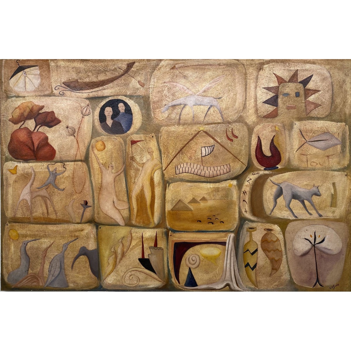 An anthology of memory fragments and personal mythologies, enclosed in golden niches that transform the canvas into a modern archive of the soul.