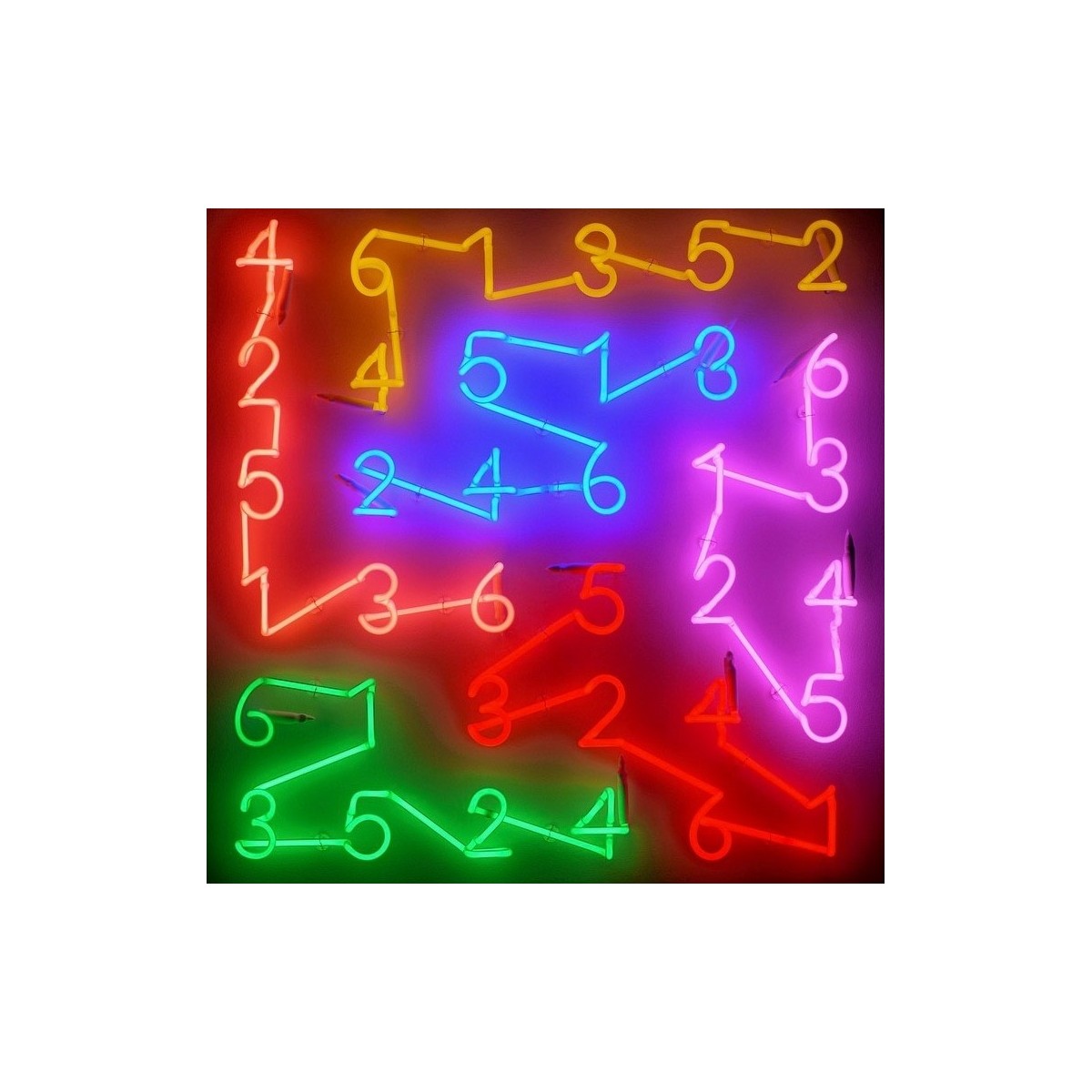 L'opera "CHAOS 361" di Albert Hien è un'installazione luminosa dinamica che esplora l'interazione tra numeri, colore e disordine controllato. Utilizzando sistemi al neon, legno e pittura, l'artista crea una complessa griglia astratta di cifre casualmente collegate, incastonate su uno sfondo scuro dipinto. La composizione presenta numeri da 1 a 6 tracciati in tubi al neon di diversi colori intensi—giallo, blu elettrico, verde brillante, rosso e viola.