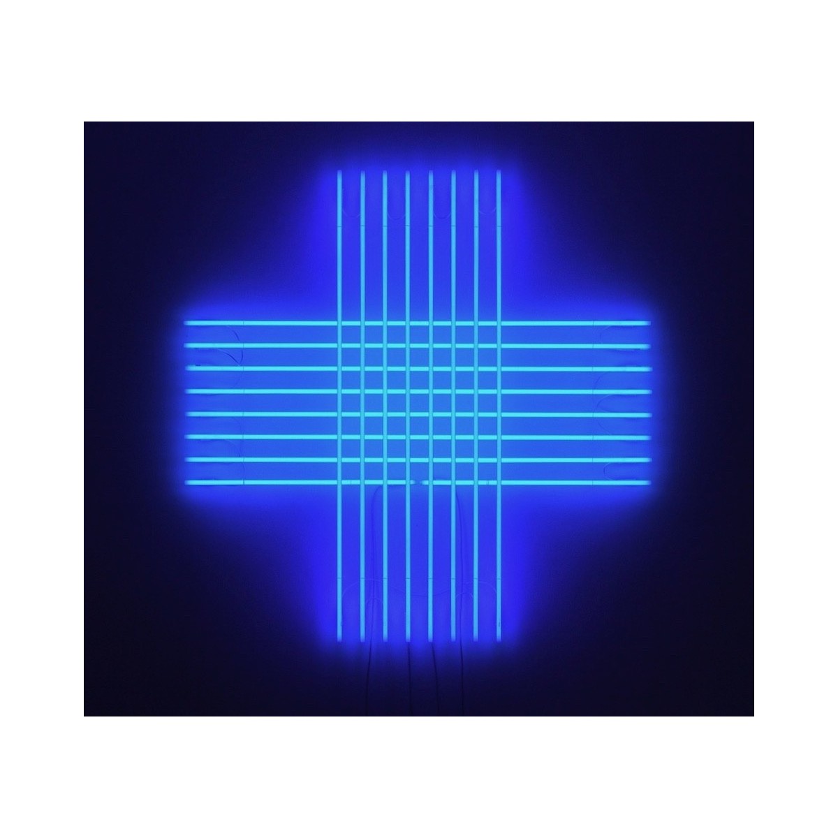 Quest'opera astratta di Albert Hien è una potente esplorazione del minimalismo geometrico attraverso la luce al neon. La composizione è dominata da una grande "X" formata dall'intersezione di due gruppi di tubi luminosi paralleli. L'installazione utilizza sistemi al neon e si basa su un forte dualismo cromatico: le linee diagonali di destra sono in un rosso arancio intenso, mentre quelle di sinistra brillano di un viola/magenta vibrante.