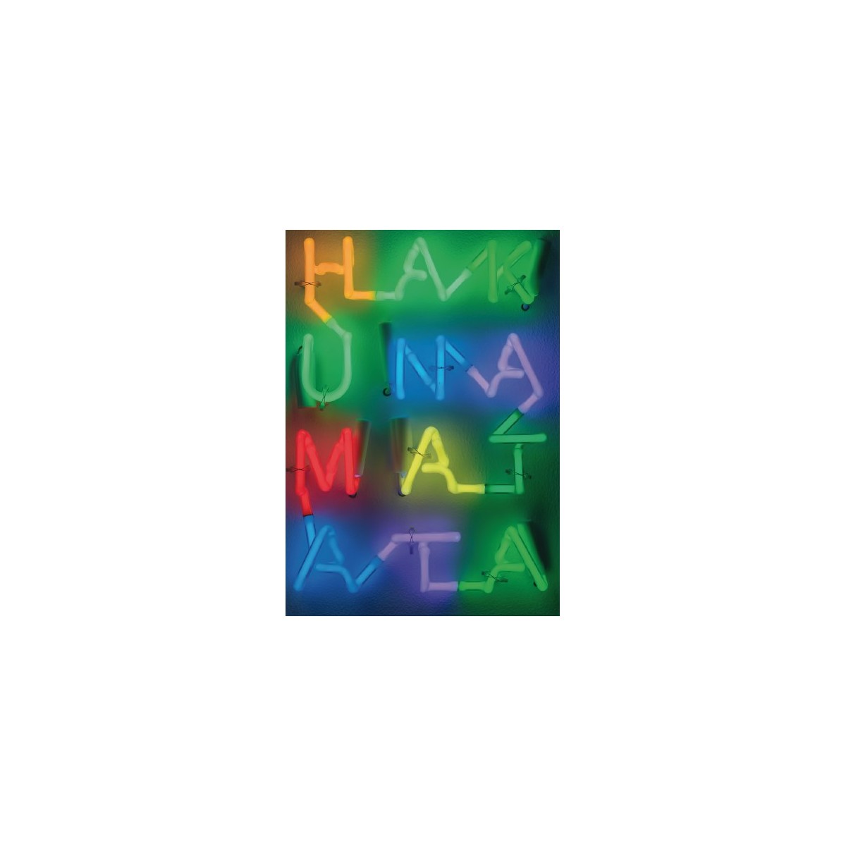 L'opera "HAKUNA MATATA" è un'installazione luminosa di Albert Hien che incarna il suo interesse per il linguaggio e l'estetica popolare. La celebre frase swahili, che significa "senza pensieri", è scritta in quattro righe di tubi al neon che riempiono lo spazio in modo compatto. L'artista utilizza una ricca palette di colori neon che mutano continuamente (dall'arancione, al blu, al rosso, al giallo e al viola) per conferire all'opera un'energia gioiosa e spensierata. Le lettere sono scomposte e assemblate in modo dinamico, creando un vivace intreccio cromatico. Con dimensioni di 33×23,5×10 cm, l'opera è un piccolo ma potente oggetto luminoso, un promemoria visivo che fonde un messaggio di cultura pop con l'arte concettuale.