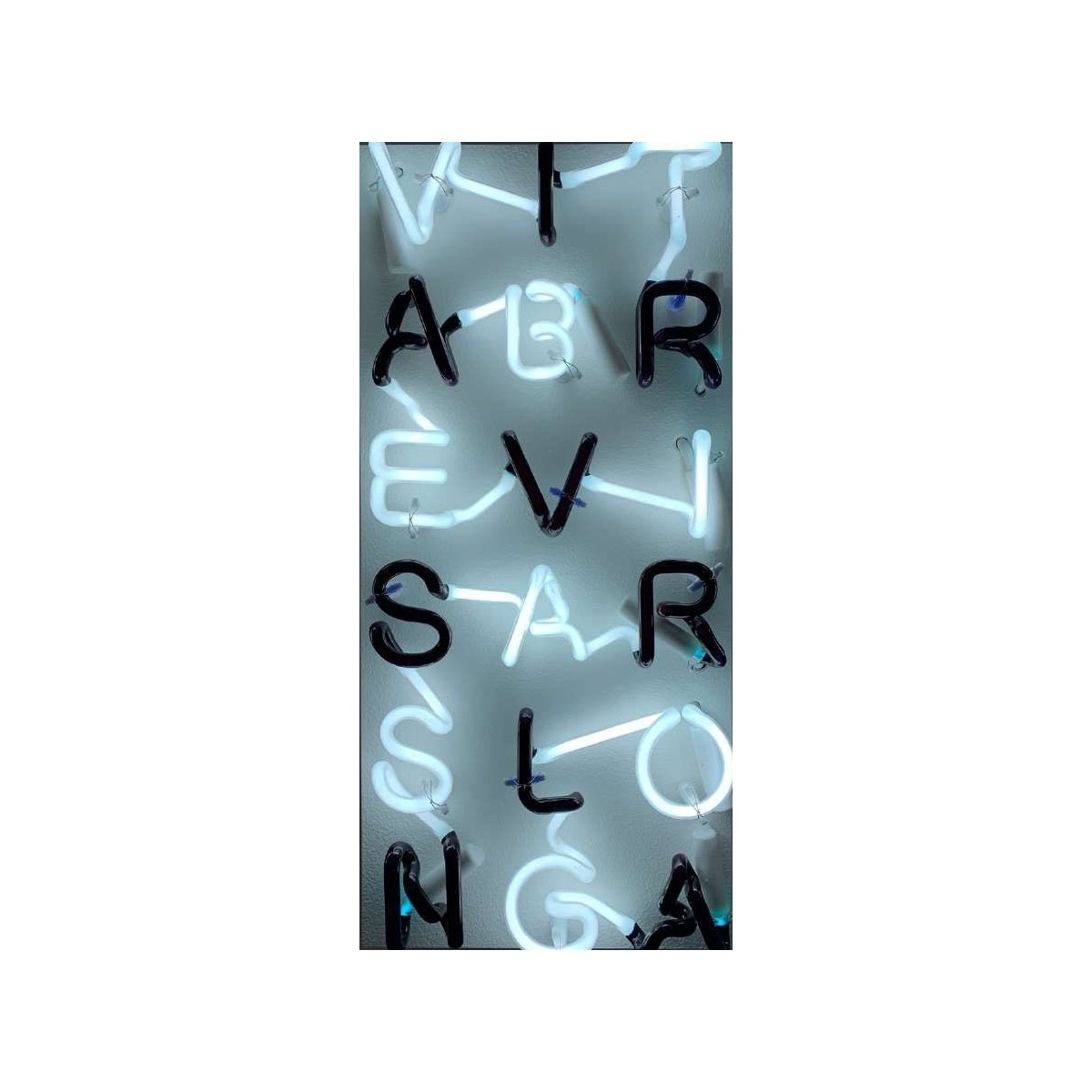 L'opera "VERBOS VOLANS" di Albert Hien è un'installazione luminosa verticale che evoca la celebre massima latina "Verba volant, scripta manent" (Le parole volano, gli scritti restano), abbreviandola e adattandola. L'artista presenta la frase con lettere al neon frammentate, disposte su cinque righe su uno sfondo chiaro. Hien gioca con il contrasto tra le lettere illuminate in un bianco/azzurro freddo e quelle lasciate scure o spente, enfatizzando l'idea di parole che "volano" via o si dissolvono.
