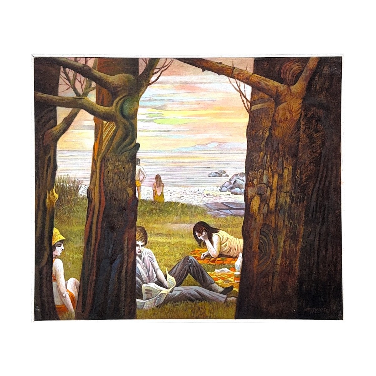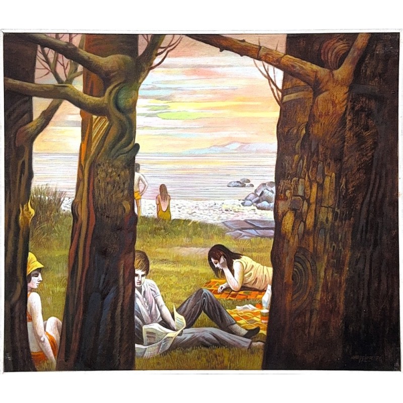 In Tempo di vacanza Filippo Maggiore cattura un momento di quiete sospeso tra natura e quotidianità. Attraverso l’intreccio tra figure e paesaggio, l’artista costruisce una scena di equilibrio e malinconia, in cui la luce del tramonto trasforma la realtà in visione interiore. I tronchi in primo piano diventano cornice e soglia, dove il tempo sembra rallentare fino a farsi memoria.