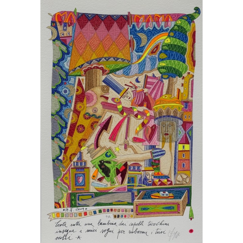 Francesco Musante intreccia segno e parola in un universo fantastico popolato da sogni, simboli e colori. Le figure sembrano galleggiare in una dimensione sospesa, dove il reale e l’immaginario si confondono. La “bambina dai capelli turchini” evoca l’infanzia, la meraviglia e la nostalgia.