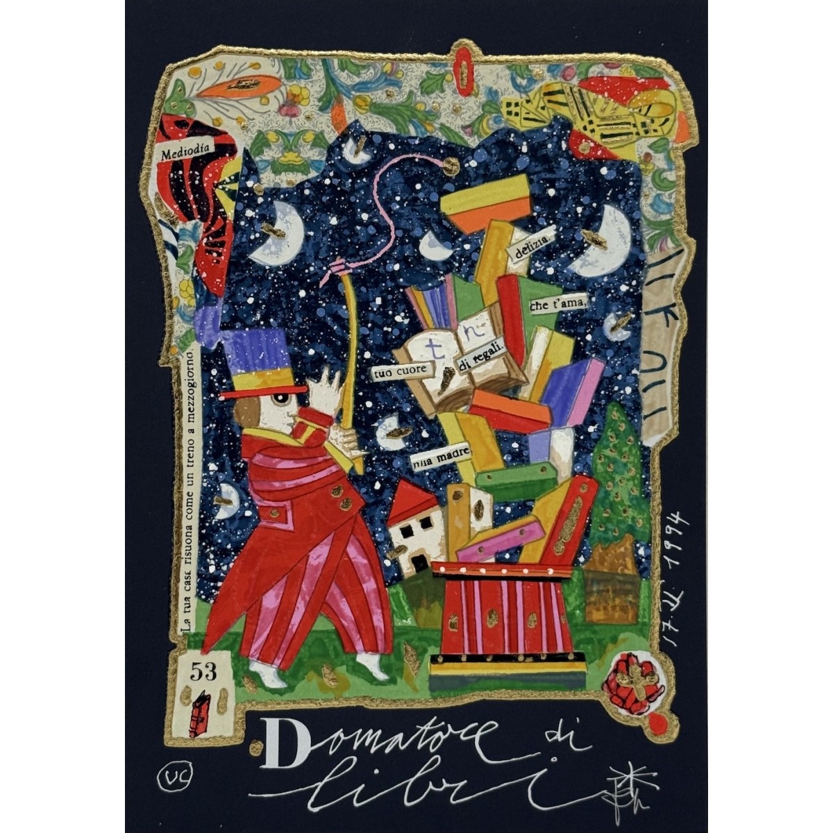 Questa serigrafia polimaterica è un'esplosione onirica immersa in un profondo cielo blu notte, tempestato di stelle glitterate e falci di luna. La composizione è strutturata attorno a un grande libro aperto in primo piano, le cui pagine fungono da finestre su altri mondi, inclusi ritratti e scene marine. Nel cielo fluttuano personaggi circensi, un elefante in equilibrio, velieri e aeroplani giocattolo, simboli del viaggio e della fantasia.