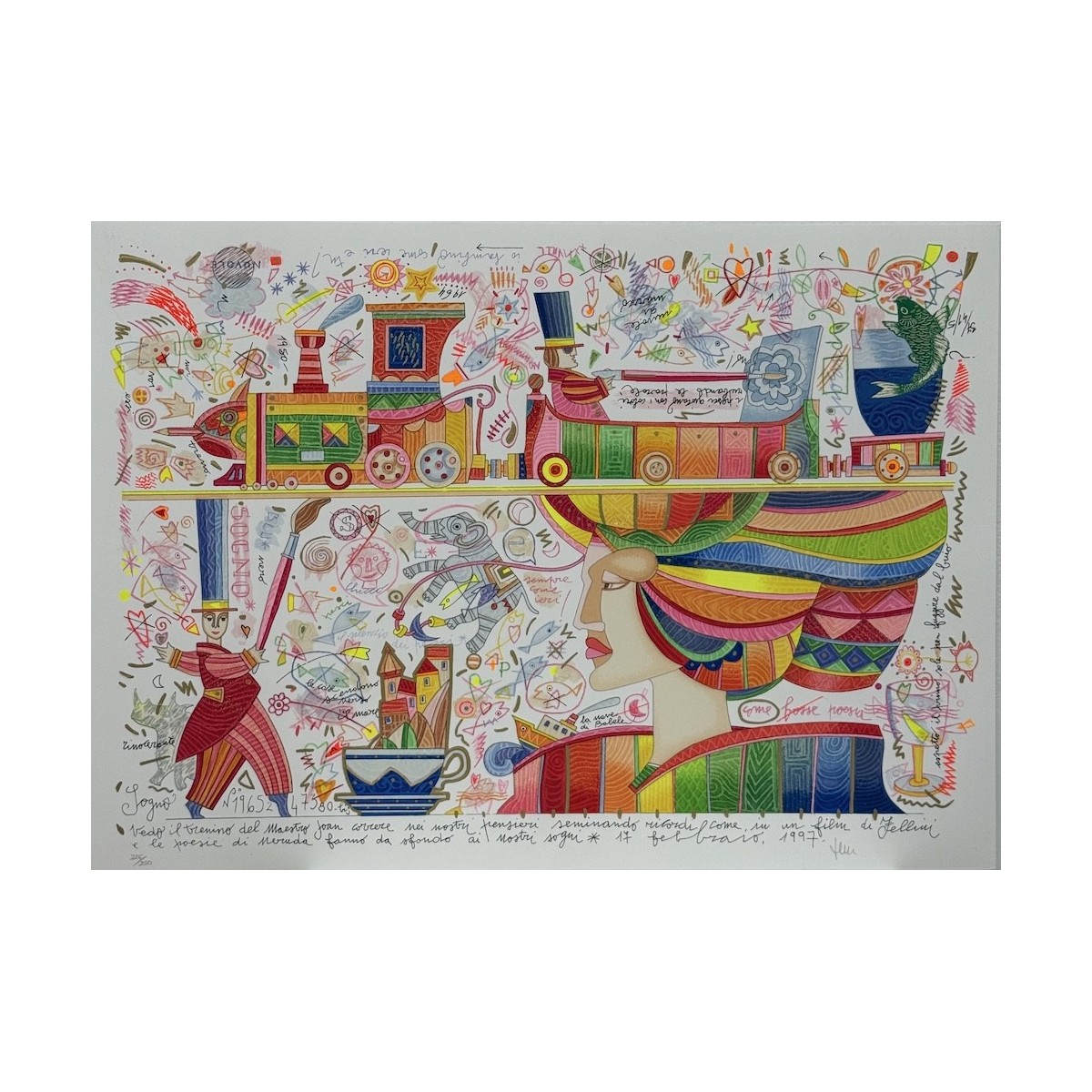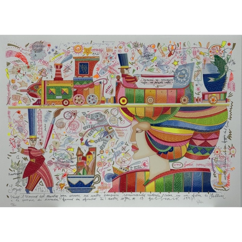 Questa serigrafia si distingue per l'uso di un fondo chiaro, sul quale Musante traccia una fitta trama di disegni e scritte che sembrano appunti di un sogno. La composizione è divisa in due sezioni: in alto, domina un trenino colorato e stilizzato, guidato da un personaggio con cappello a cilindro, che simboleggia il viaggio onirico.