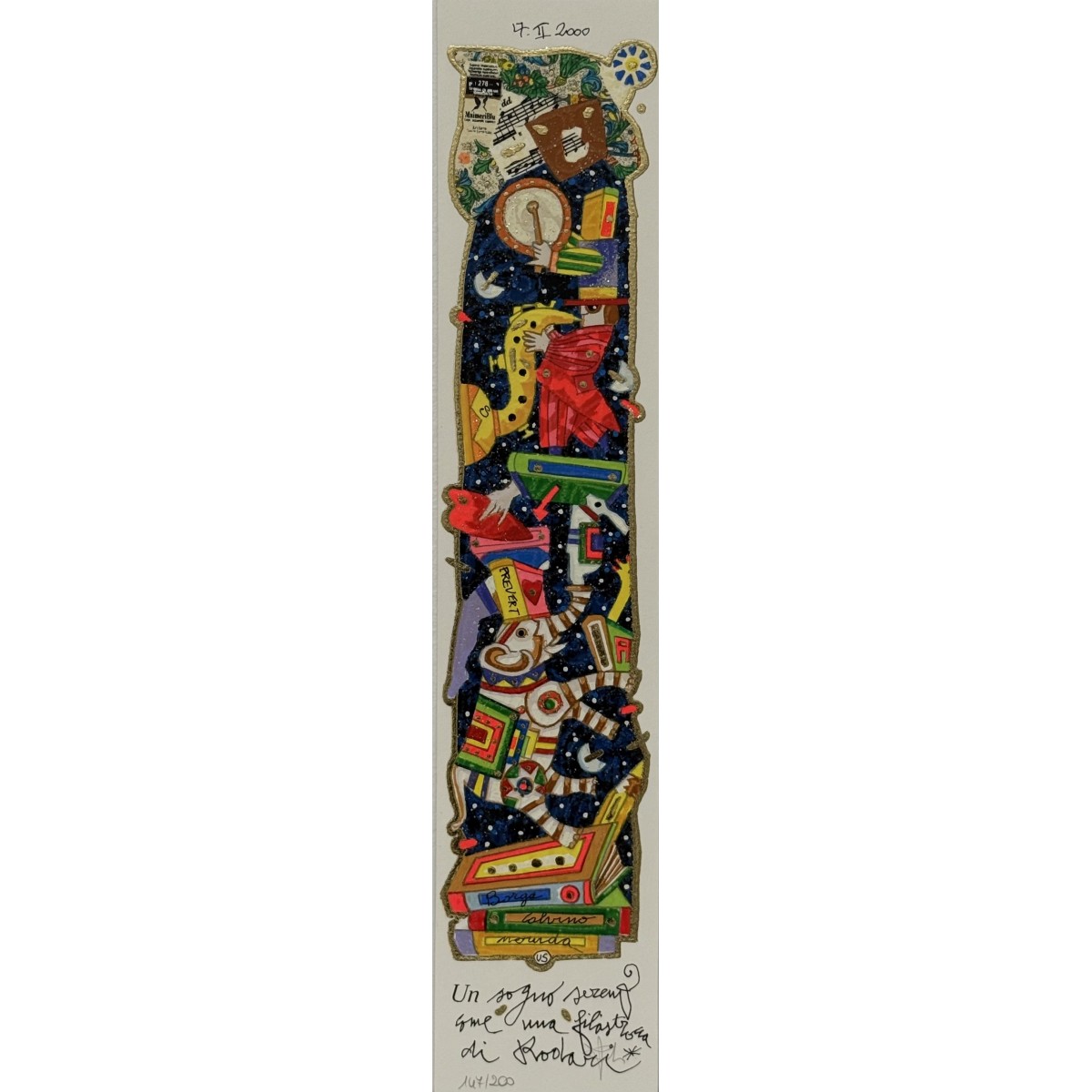 Questa serigrafia, in formato verticale e allungato, è un omaggio al mondo ludico e poetico di Gianni Rodari, menzionato nel titolo. Il fondo è un cielo notturno blu intenso e glitterato, che amplifica il senso di sogno. La composizione si sviluppa su una pila di oggetti che simboleggiano la creatività e l'infanzia, tra cui libri e vecchie cassette musicali.