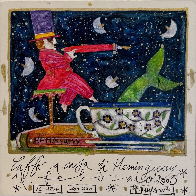 Quest’opera di Francesco Musante, intitolata “Caffè a casa di Hemingway” (2003), è un vivace e poetico esempio del suo stile onirico e narrativo. La scena mostra un personaggio in abiti eccentrici, seduto su un libro con la scritta “Hemingway”, che osserva il cielo stellato attraverso un cannocchiale. Accanto a lui, una grande tazza decorata e una coda di balena emergono come elementi fantastici.