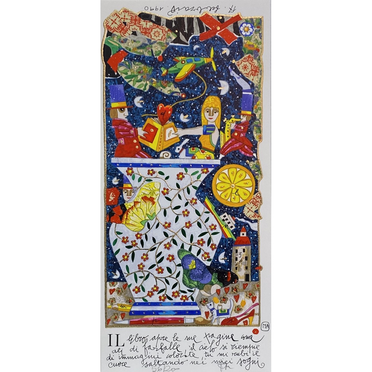 L'artista crea un mondo onirico e fiabesco, denso di elementi simbolici come cuori rossi, un aereo giocattolo che vola sotto un cielo stellato, e personaggi stilizzati con cappelli eccentrici. Il grande vaso centrale, decorato con un motivo floreale, funge da portale verso un'immaginazione ricca e colorata, invitando lo spettatore a "saltare nei sogni", come suggerisce il testo autografo dell'artista.