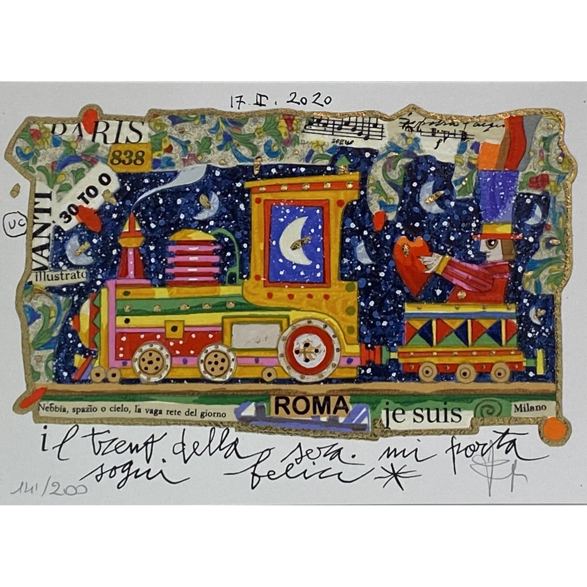 Questa serigrafia polimaterica di Francesco Musante, intitolata "Il treno della sera mi porta sogni felici", è un'opera gioiosa e fiabesca. Rappresenta un treno colorato che viaggia in un cielo notturno pieno di stelle e mezze lune, fungendo da veicolo per l'immaginazione e i sogni. L'utilizzo di colori vivaci e l'aggiunta di elementi materici come il glitter e la foglia d'oro sono tratti distintivi del suo stile onirico e poetico.