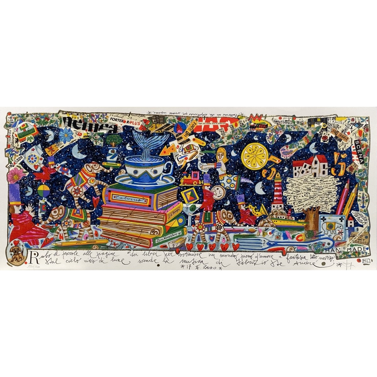 Questa serigrafia polimaterica di Francesco Musante è un'esplosione onirica di colori e citazioni che omaggia la letteratura e la musica di Fabrizio De André. L'opera trasforma il piano visivo in un racconto fiabesco dove elefanti decorati, lune sospese e una tazzina da tè con una coda di balena galleggiano sopra pile di libri di Calvino e Bukowski.
