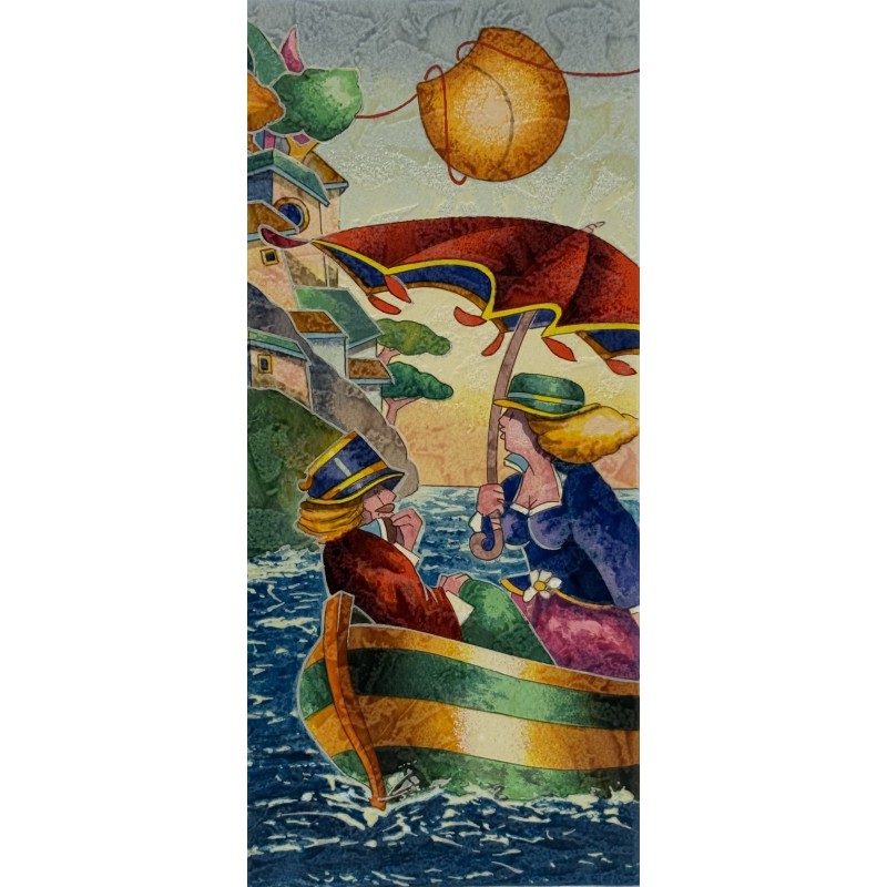 Due figure sono in barca, mentre una donna regge un grande ombrello aperto. La composizione è dominata dal dialogo e dalla tensione emotiva, incorniciata da un borgo stilizzato sulla costa e dal suo simbolico pallone aerostatico/luna. La scena fonde l'ambientazione marina con un'atmosfera sospesa e ricca di sottintesi.