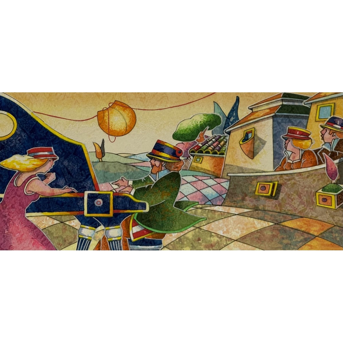 Questa serigrafia polimaterica orizzontale di Francesco Nesi ritrae una scena di sorpresa e ammirazione in un contesto urbano e collinare. Due figure in costume d'epoca interagiscono con un grande oggetto stilizzato in primo piano, che sembra una macchina o un veicolo.