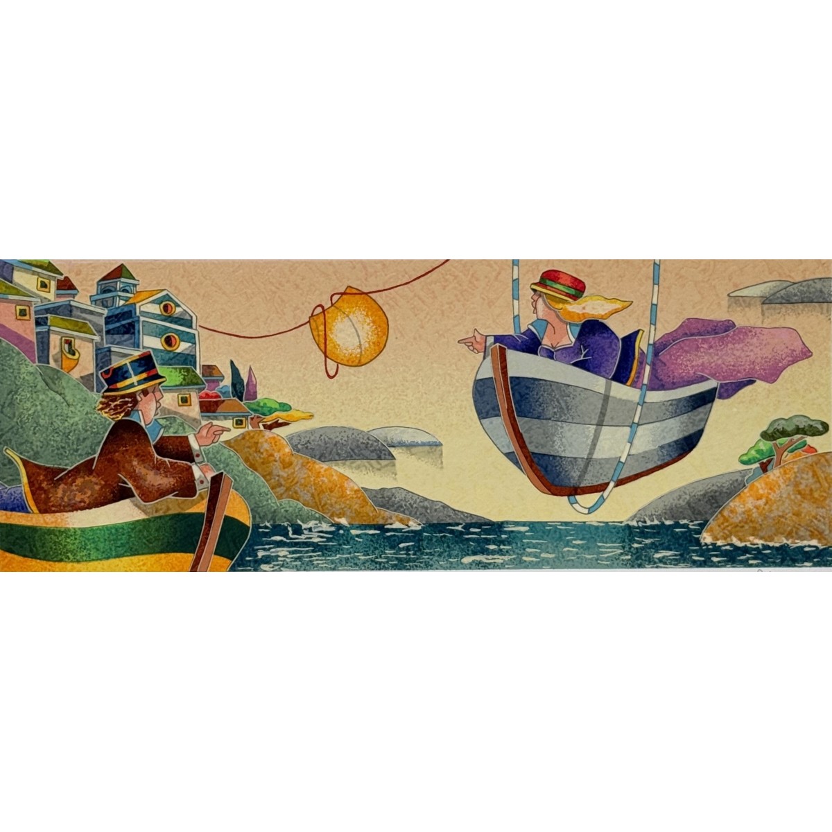 Questa serigrafia polimaterica celebra un "Meraviglioso Incontro", dove l'atmosfera onirica di Nesi si manifesta attraverso due personaggi sospesi e fluttuanti su un mare vibrante. Le loro imbarcazioni, poste tra un paesaggio urbano fantastico e una luna stilizzata, trasformano un semplice saluto in un momento di magica ironia.