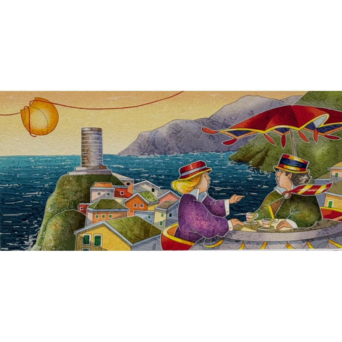 L'opera "Torre Magica" ritrae due eleganti figure in un intimo momento di conversazione e caffè su un terrazzino affacciato sul mare, protette da un grande ombrellone rosso e con una torre solitaria che domina il paesaggio costiero.