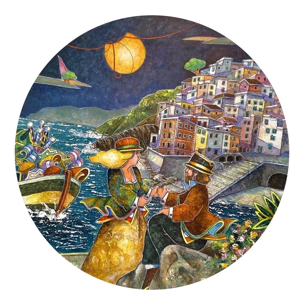 In questa composizione circolare, un uomo offre simbolicamente i propri sogni a una donna davanti a un mare vibrante e un borgo scosceso. La barca carica di tesori colorati e la luna appesa nel cielo notturno raccontano la ricchezza di un sentimento che si fa dono. È un racconto poetico di accoglienza e bellezza che abbraccia l'intero orizzonte dell'anima.