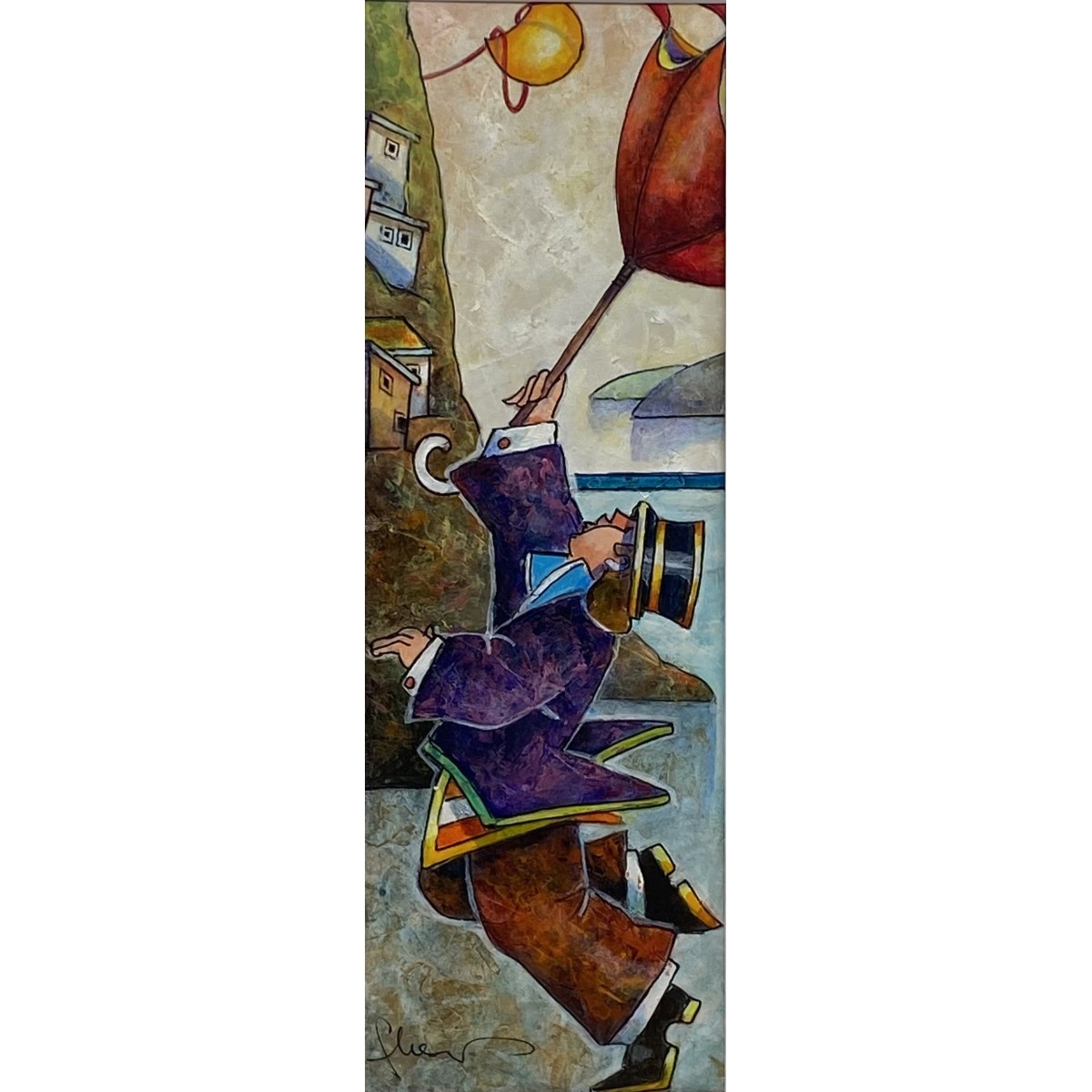 In questo formato verticale slanciato, un sognatore solitario si libra verso l'alto sorretto da un grande ombrello rosso, creando un contrasto poetico tra la leggerezza del volo e la solidità geometrica del borgo ligure che si arrampica sulla roccia.