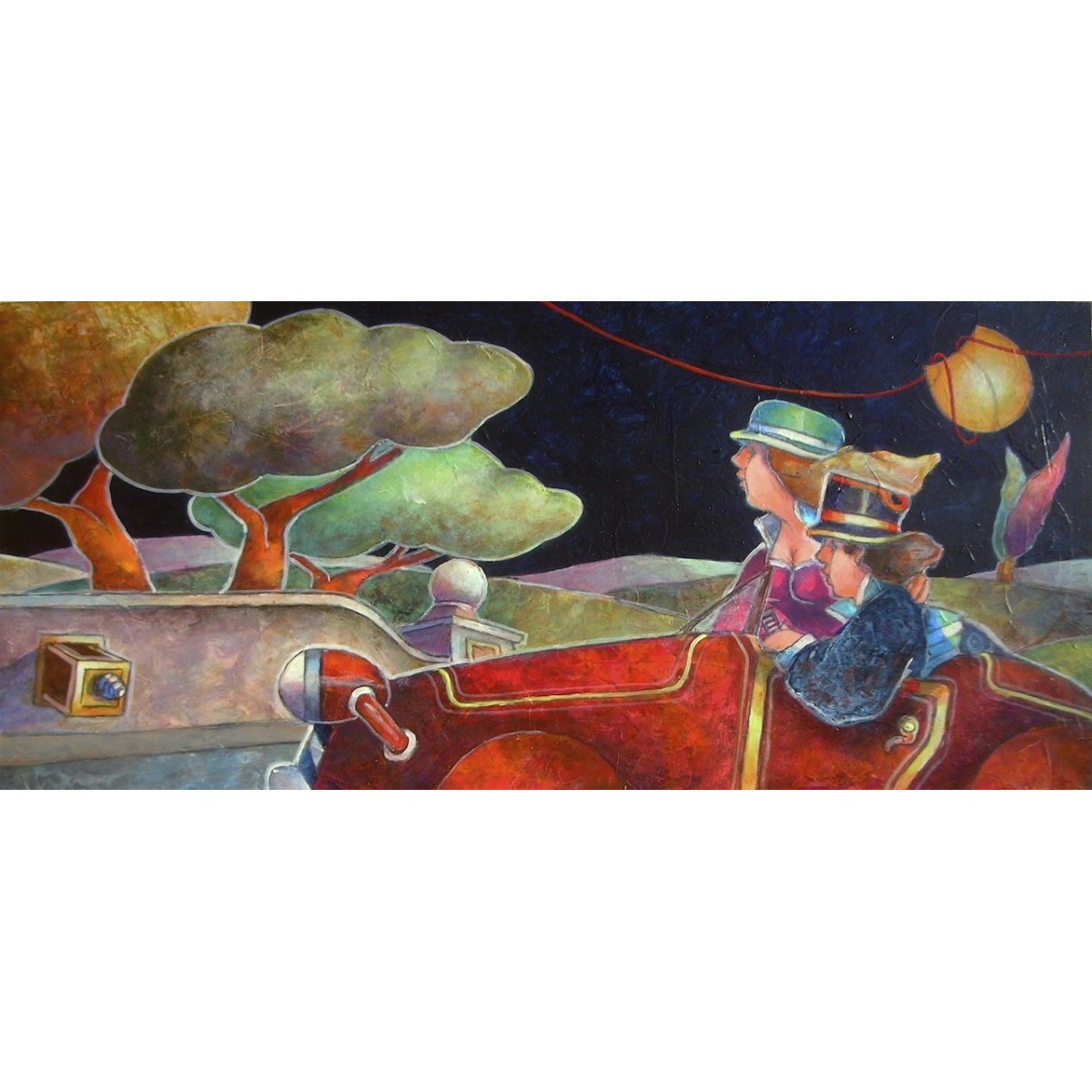 Quest'opera di Francesco Nesi, intitolata “Segreti in un cassetto”, ci immerge in una scena notturna e onirica, catturando due figure eleganti e dal cappello eccentrico a bordo di una vettura fiammeggiante. La composizione orizzontale guida lo sguardo attraverso il dinamismo del veicolo, dipinto con rossi vibranti e riflessi cangianti.