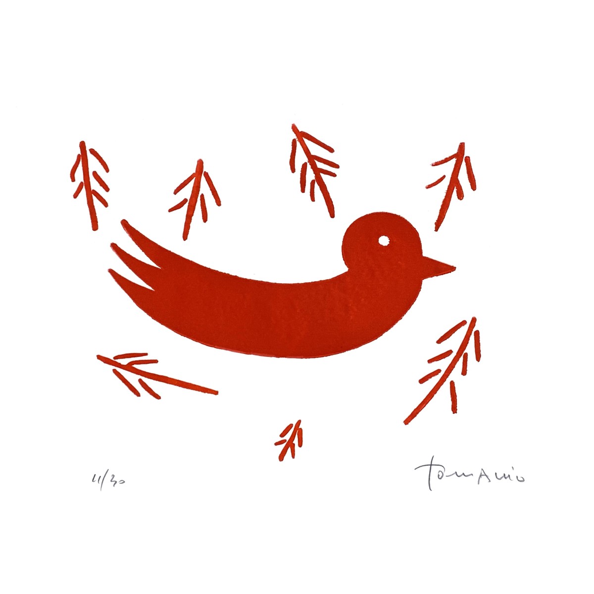 Cimbello di Giuliano Tomaino, realizzato in calcografia e acquaforte in tonalità rossa, presenta un segno incisivo ed essenziale. L’immagine, spesso legata al motivo simbolico dell'uccellino, evoca memoria, infanzia e gioco con una forza grafica intensa. Il rosso amplifica la componente emotiva, dando all’opera un carattere insieme minimale ed evocativo.