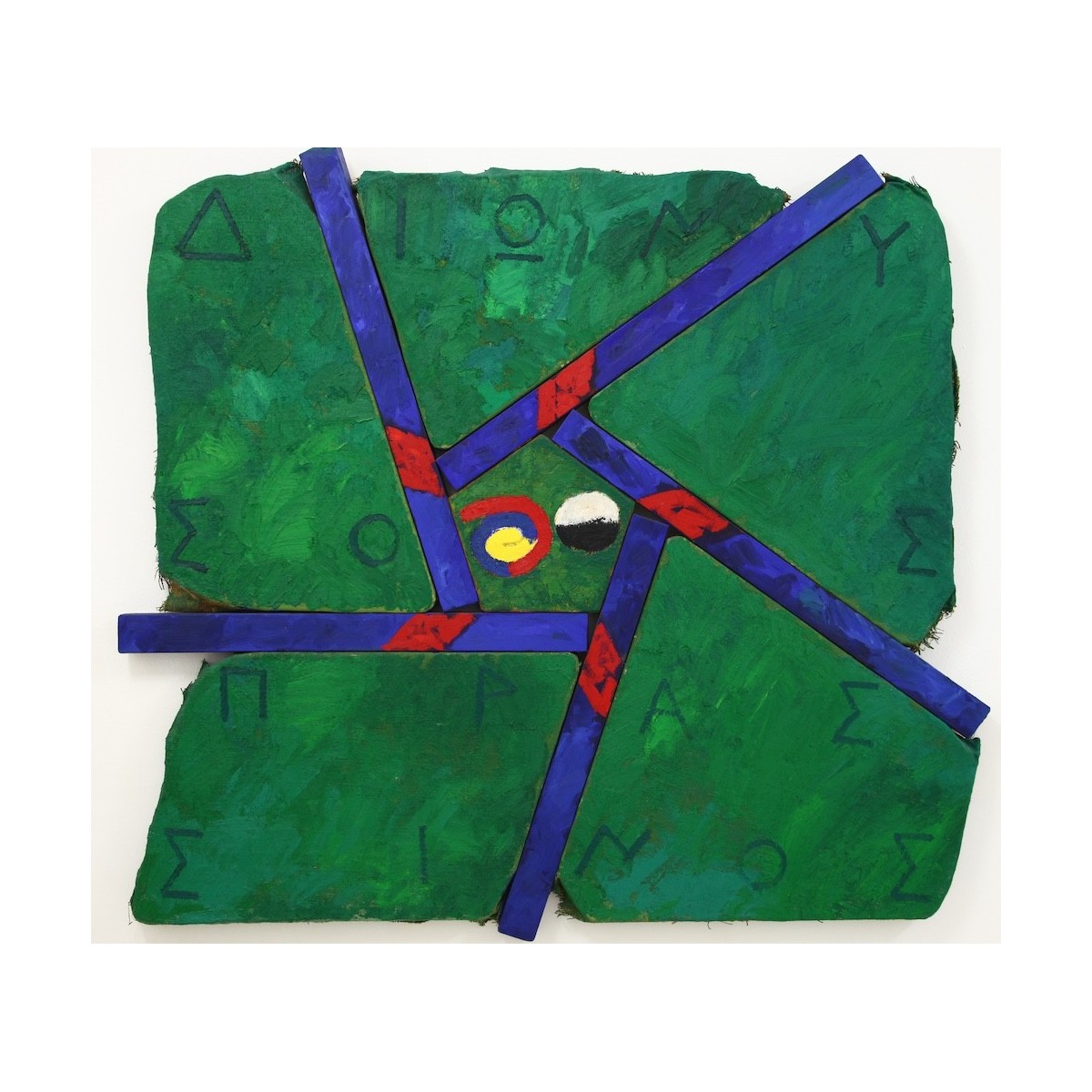 Quest'opera riflette la fascinazione di Joe Tilson per la mitologia greca, evocando l'energia del dio Dioniso attraverso una composizione astratta ma simbolica. La superficie è dominata dal verde intenso e materico, che simboleggia la natura e la vitalità; il fondo irregolare è attraversato da fasce geometriche blu e rosse. Lettere dell'alfabeto greco sono dipinte o incise per comporre il titolo sulla tela, mentre un vortice centrale in colori primari aggiunge un forte elemento dinamico. La tecnica ad olio su tela montata su legno enfatizza la matericità, tipica della sua produzione matura.