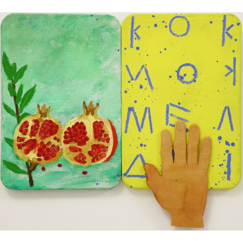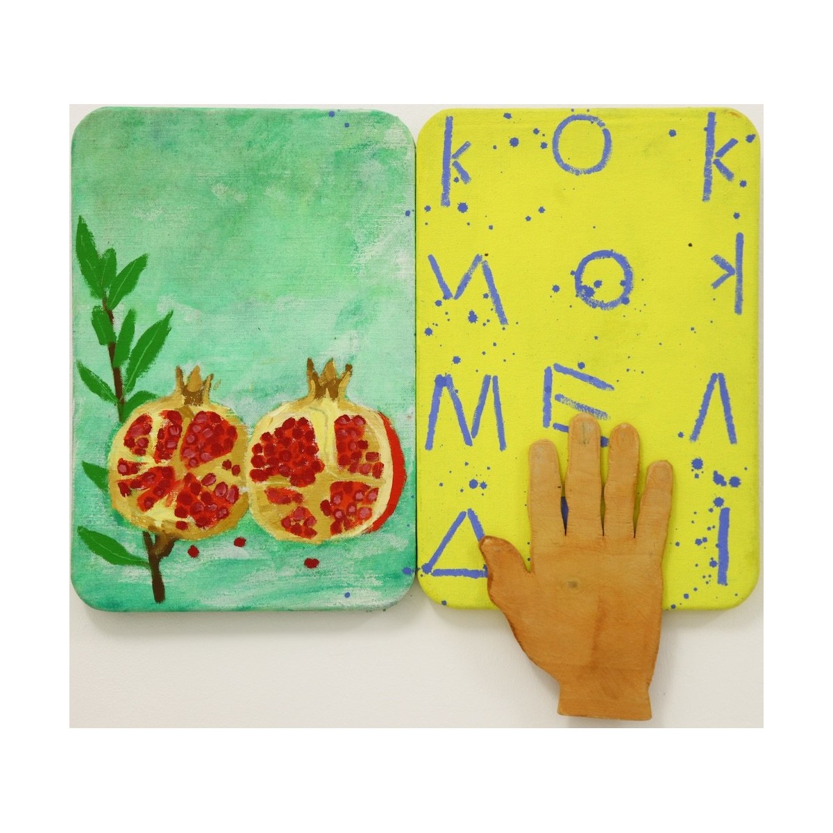 Quest'opera bifronte (due pannelli affiancati) continua la serie di Tilson dedicata alla mitologia greca, qui omaggiando Demetra, dea del raccolto. I due pannelli in legno con angoli arrotondati creano un effetto di dittico che richiama le tavolette antiche. Il pannello di sinistra, in verde acquamarina, presenta una pittura figurativa di due melograni aperti, simbolo di fertilità e del mito di Proserpina. Il pannello di destra, in giallo acceso, è un'esplosione grafica con lettere greche dipinte in blu e una mano tridimensionale in legno applicata.