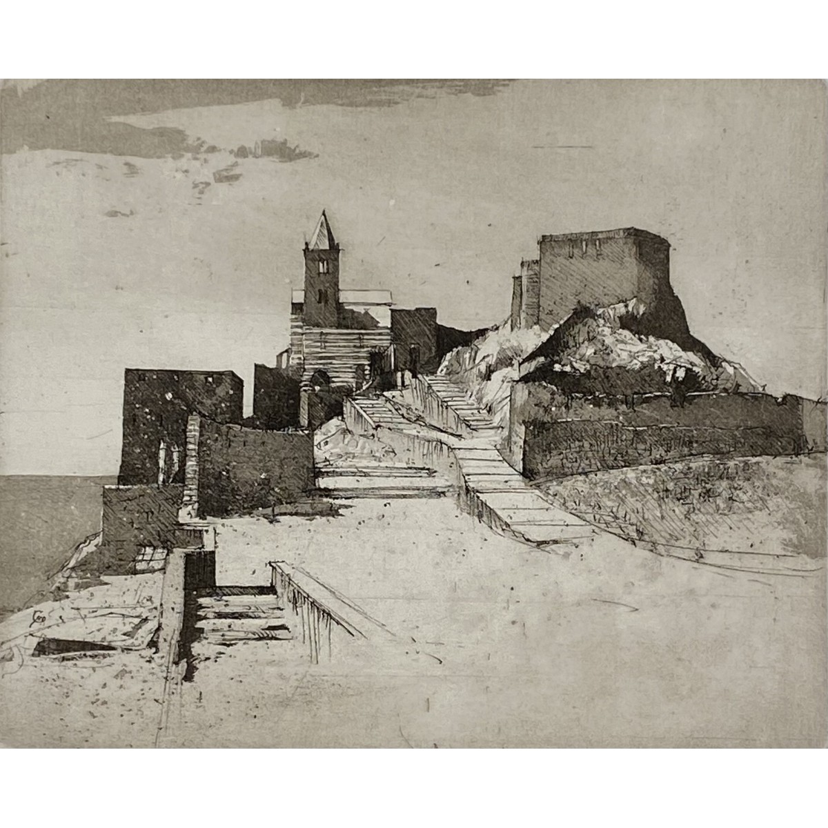 In questa vernice molle-acquatinta, Marcon trasfigura l'architettura di Portovenere in una visione poetica fatta di volumi essenziali e atmosfere silenziose.