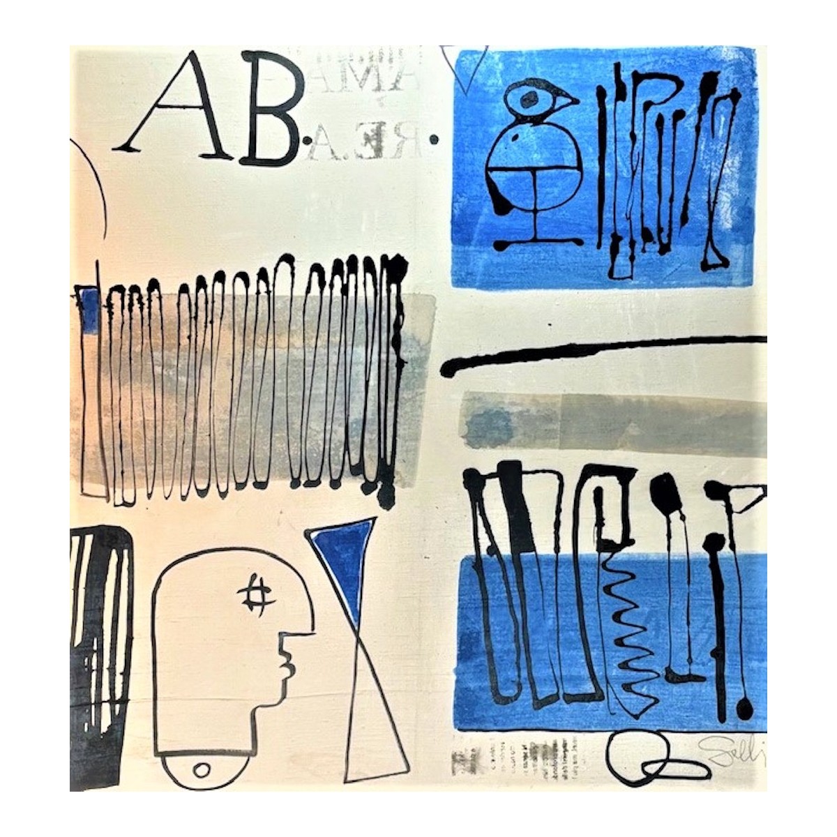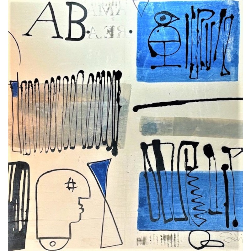 Quest'opera astratta di Marcello Scarselli si concentra sull'interazione tra segni grafici e campiture di colore. La tela è divisa in quadranti da spazi neutri, dove si alternano sezioni in bianco sporco e blocchi di blu brillante. Simboli, testo e disegni figurativi stilizzati sono giustapposti. L'artista utilizza la ripetizione di linee nere verticali e drippings per creare un senso di ritmo e movimento, giustificando il titolo "Vibrazioni".