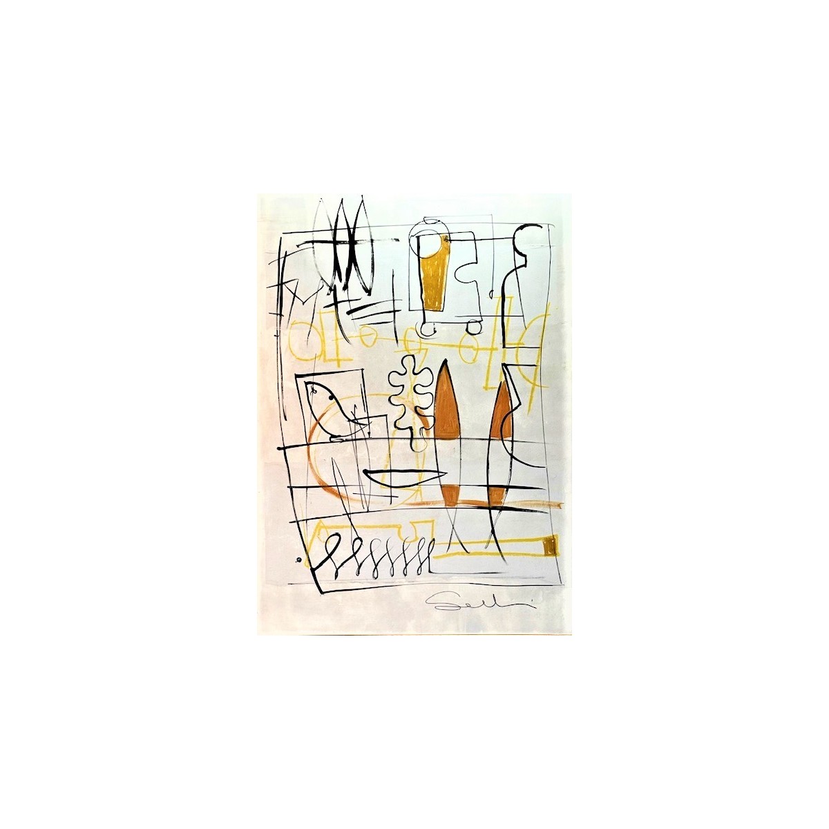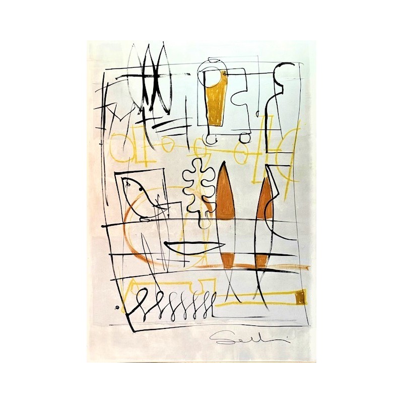 Quest'opera di Marcello Scarselli è una composizione astratta che evoca il ritmo e l'armonia di una sinfonia attraverso la stratificazione di segni grafici e forme geometriche. La tavola è dominata da un disegno a linea nera gestuale, con tratti spessi, sottili e curvi che creano un senso di movimento continuo. L'opera bilancia il caos apparente delle linee gestuali con una struttura sottostante, suggerendo che la "sinfonia" è l'interazione complessa e ritmica tra segno e colore.