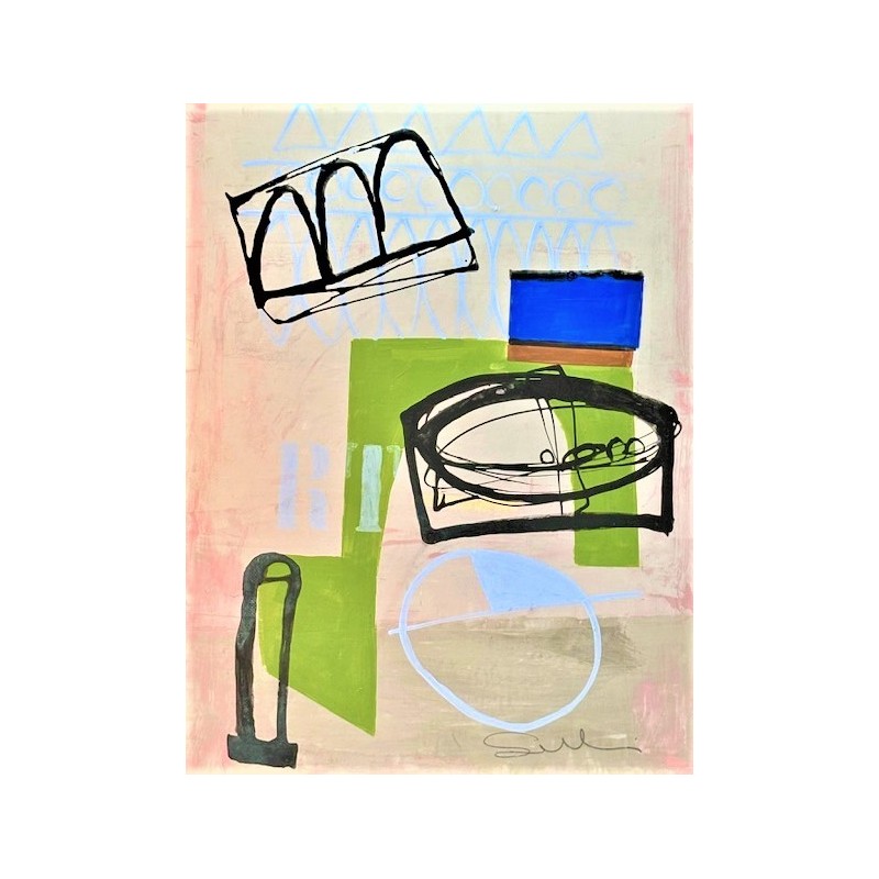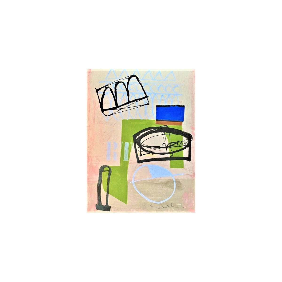 Quest'opera astratta di Marcello Scarselli si concentra sull'interazione tra forme geometriche semplici e spazi gestuali. Lo sfondo è dominato da tonalità neutre e pastello (rosa pallido e beige) con campiture di verde brillante e blocchi di blu saturo. Le linee in azzurro e rosa creano un ulteriore strato grafico, conferendo all'opera un senso di profondità e un linguaggio che bilancia la giocosità del colore con la forza del segno astratto.