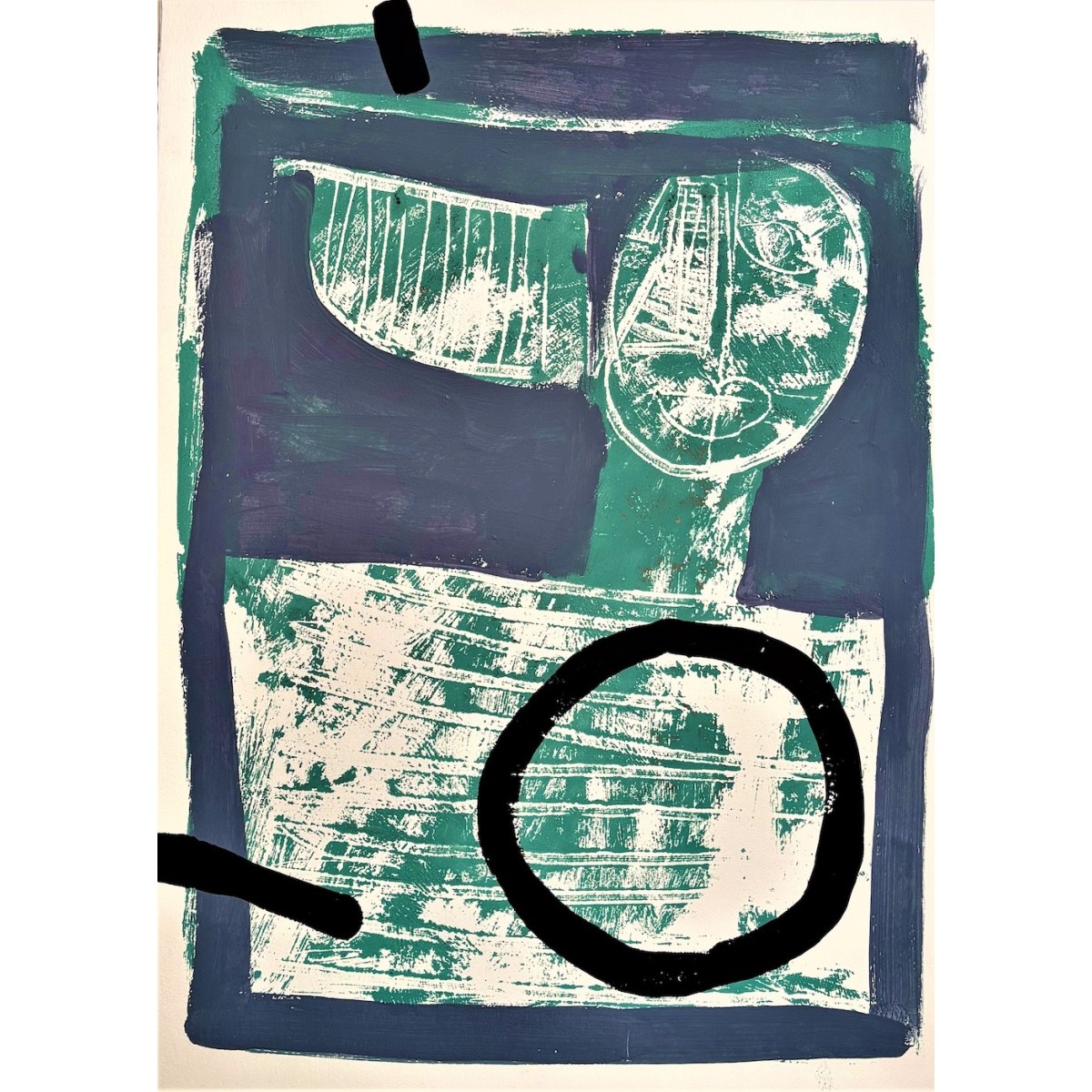Quest'opera astratto-figurativa di Marcello Scarselli è dominata da una palette di blu profondo, verde smeraldo e bianco. La composizione si basa sulla sovrapposizione di strati di colore con ampie pennellate che lasciano intravedere gli strati sottostanti. L'opera gioca sull'ambiguità tra la forma geometrica e la pittura gestuale, trasmettendo un senso di urgenza e di forza grezza tipica dell'espressionismo astratto.