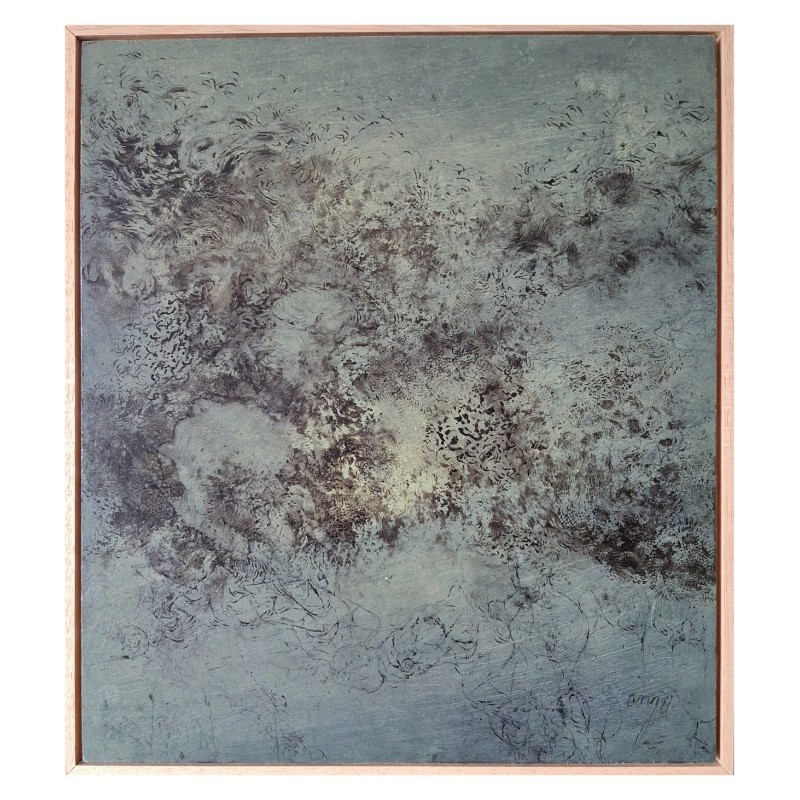 "Nel crepuscolo, all'improvviso" è un'opera astratta dominata da tonalità fredde e malinconiche di grigio-azzurro, evocando un'atmosfera crepuscolare. La superficie è densamente texturizzata con segni gestuali e vortici, interrotta al centro da una concentrazione scura che suggerisce un evento inatteso. Il contrasto tra la quiete dello sfondo e il dinamismo centrale cattura un momento di improvvisa rottura o rivelazione.