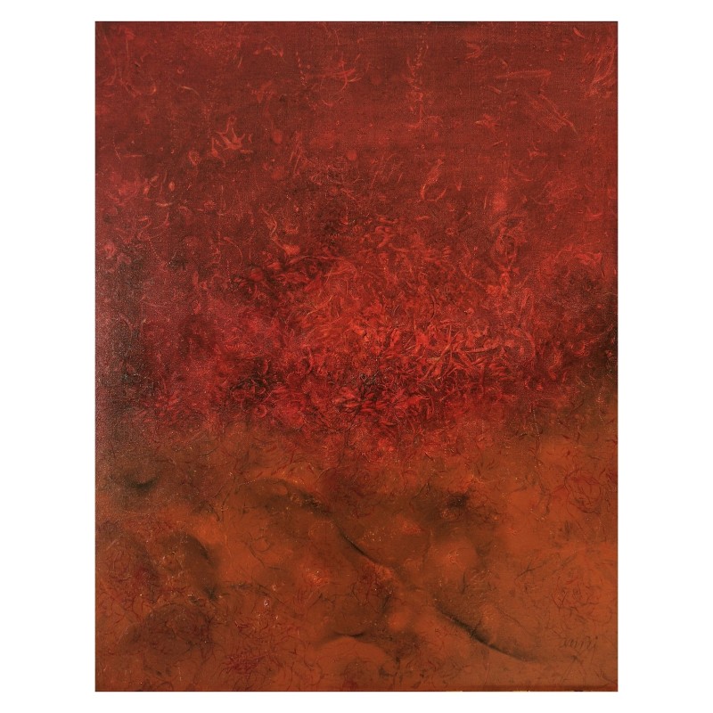 "Trio d'archi, occhi chiusi" è un esplosione astratta di rossi e aranci intensi, che mira a visualizzare l'emozione e la passione di un'esecuzione musicale. La tela è divisa da una fascia centrale densa di segni vorticosi, che simboleggiano l'apice del suono e la vibrazione delle corde. L'opera cattura un momento di profonda interiorità e sinestesia, dove il calore del colore traduce l'intensità della musica.