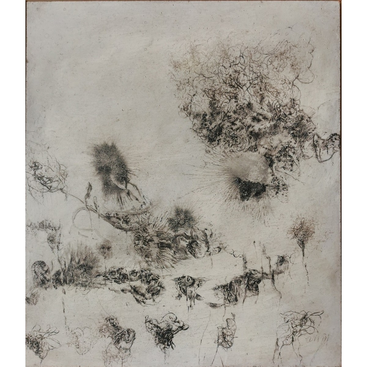 "Magico incontro" è un'opera astratta quasi monocromatica, dominata da una base chiara e una complessa rete di segni scuri e filiformi. Le forme scure e vaporose sembrano fluttuare e congiungersi in un "magico incontro" di materia e linea, evocando un'atmosfera onirica o un evento effimero. L'opera è un potente studio sul segno grafico che crea figure organiche e misteriose.