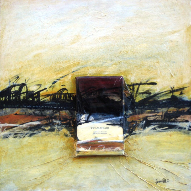 L'opera di Massimo Faraci, CCAMAFFARI, è una suggestiva composizione quadrata realizzata in tecnica mista su compensato, dove l'artista fonde astrazione e referenti urbani. Lo sfondo è dominato da una texture ricca e materica in calde tonalità di giallo ocra e beige chiaro, che suggeriscono un'atmosfera ampia e luminosa. La composizione è nettamente divisa da una fascia orizzontale scura e dinamica, caratterizzata da segni vigorosi e gestuali (neri e marroni) che evocano uno skyline indefinito o macerie industriali. Al centro, un blocco tridimensionale scuro, quasi un monolite smaltato in tonalità di bordeaux e nero, emerge in primo piano. Questo elemento centrale è evidenziato da una sezione inferiore che reca la scritta "CCAMAFFARI", assieme ad altro testo illeggibile, creando un forte punto focale. La combinazione di una base pittorica lirica e materica con l'introduzione di un elemento grafico e geometrico conferisce all'opera una dimensione di contrasto tra la fragilità del paesaggio e la densità dell'oggetto.